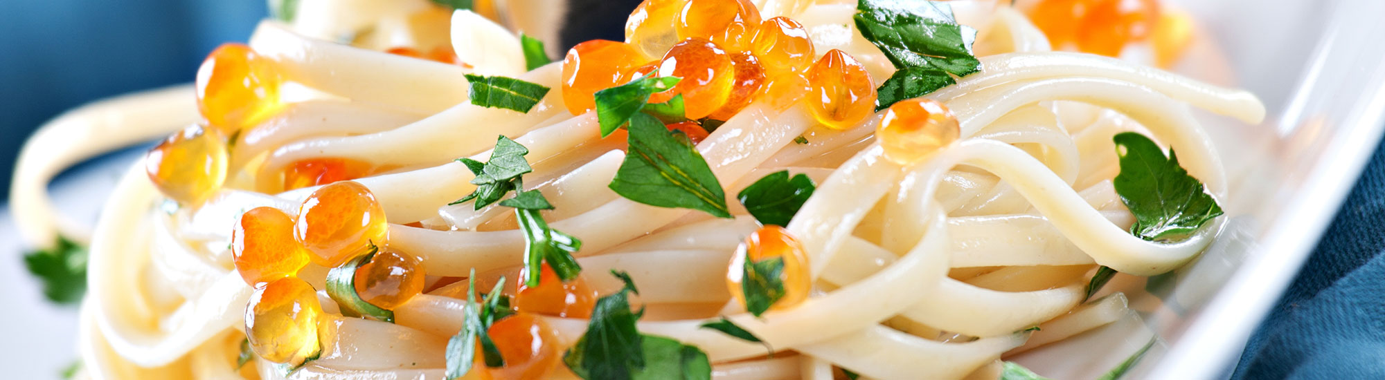 After 5-6 minutes, blend the salmon and put it back in the pan with its juices. Drain the tagliolini al dente and finish cooking it in the pan with the salmon. Add the lumpfish roe (or caviar); sprinkle some parsley and garnish with a slice of lemon.